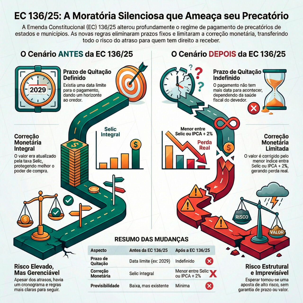 “A EC 136/25 transformou o precatório em um ativo sem prazo, com correção limitada e totalmente subordinado à conveniência fiscal do ente devedor. Para o credor, isso não é apenas atraso — é risco estrutural de perda de valor.”