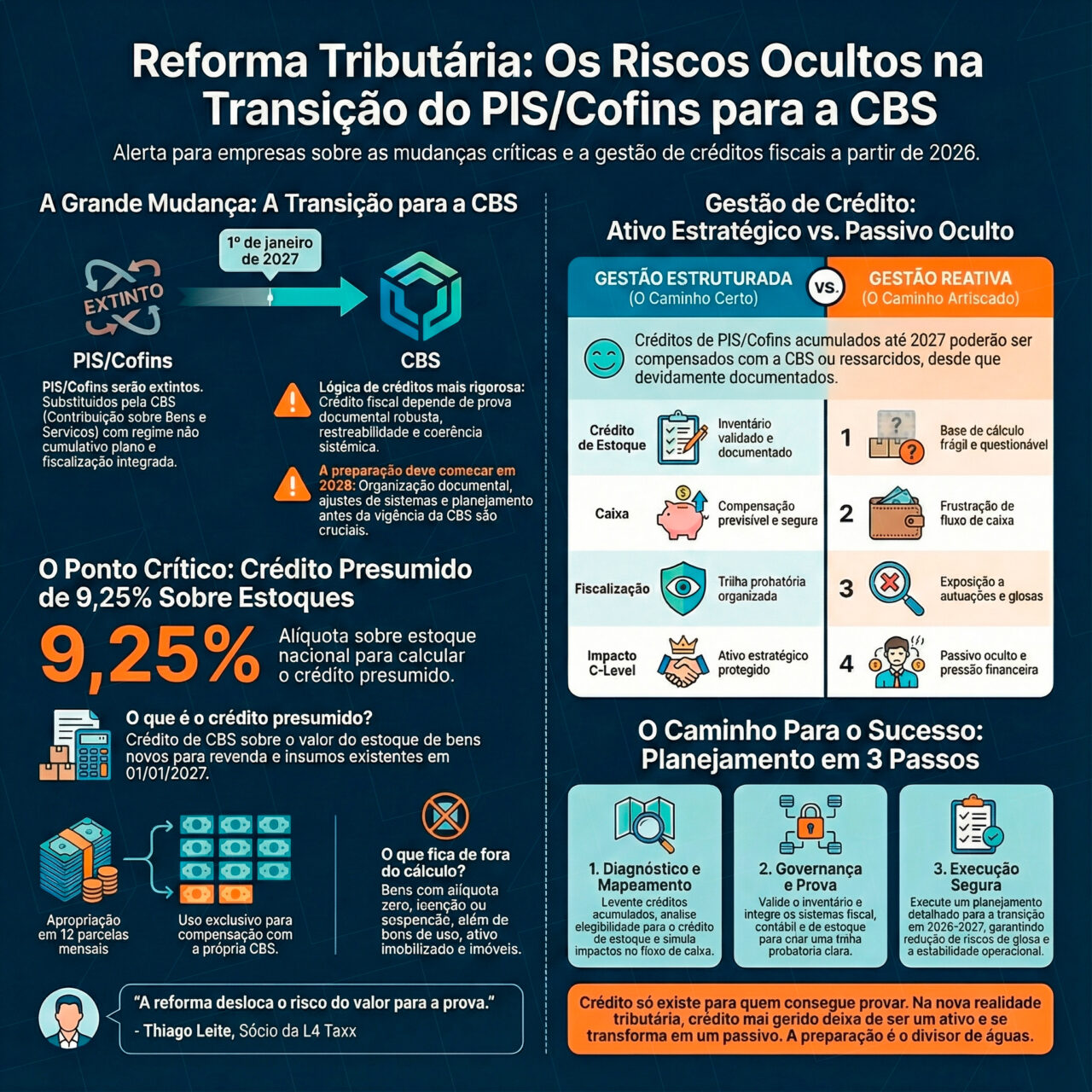 Quem tratar isso como simples cálculo de 9,25% corre o risco de perder o crédito ou sofrer glosa futura. A reforma desloca o risco do valor para a prova.”