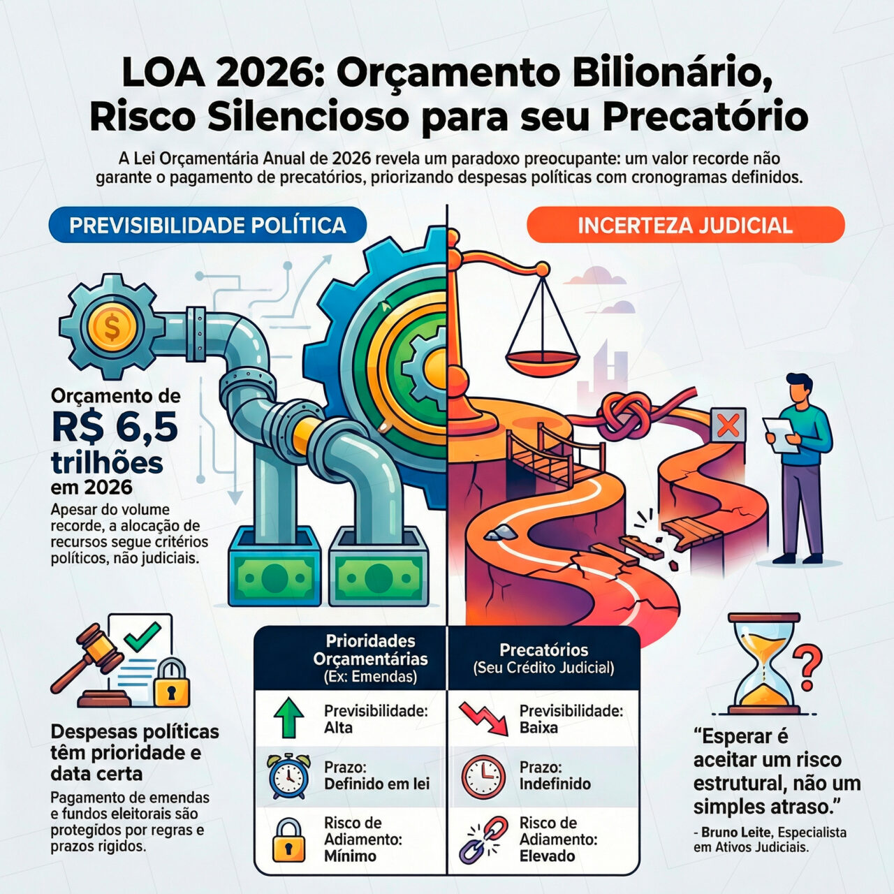 A Lei Orçamentária Anual de 2026 já está em vigor e revela, mais uma vez, uma lógica recorrente no Brasil: enquanto o orçamento cresce, as prioridades se reorganizam — e o credor de precatórios continua sem data certa para receber. O orçamento bilionário não elimina o risco; apenas redefine quem terá previsibilidade e quem continuará na fila.